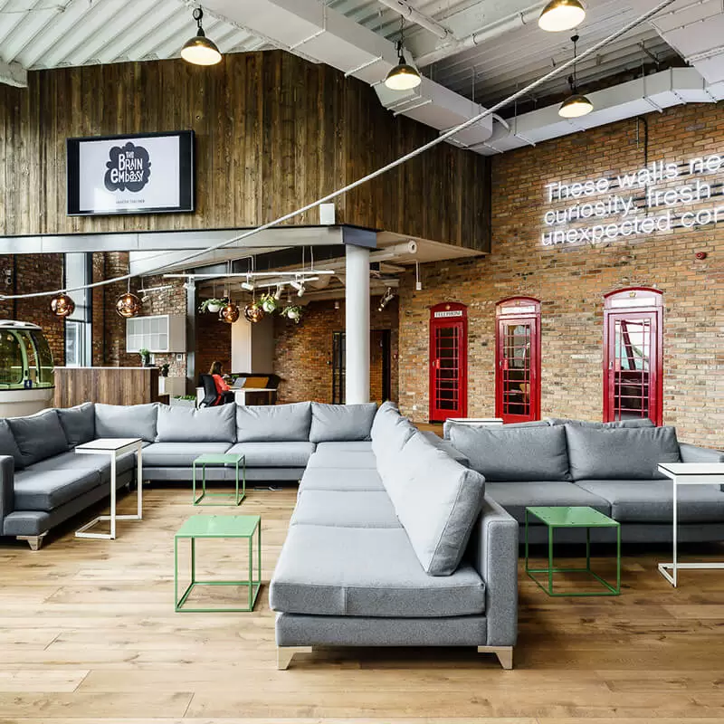Brain Embassy Jerozolimskie to cowork zlokalizowany przy głównej ulicy przecinającej Warszawę, z widokiem na zazielenioną przestrzeń Parku Szczęśliwickiego.